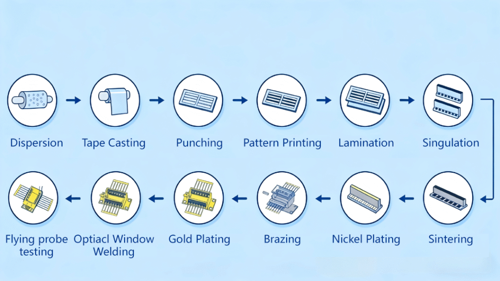 The process flow involves slurry dispersion → tape casting → punching → pattern printing → lamination → singulation (dicing) → sintering → nickel plating → brazing → gold plating → optical window welding → flying probe testing.